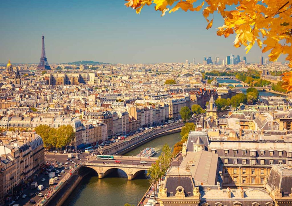 The sunlight filtering through the golden leaves of the Seine’s trees, casting dappled light on the stone path.